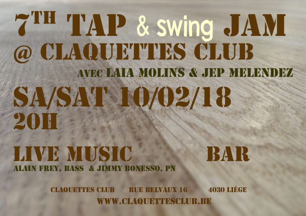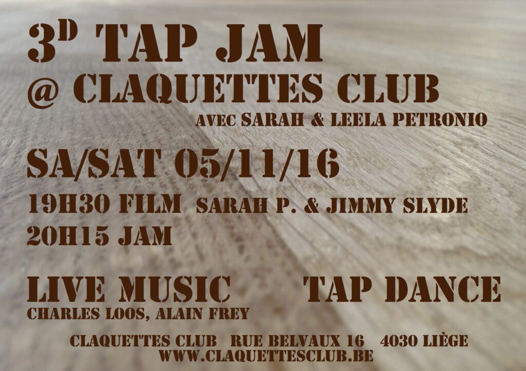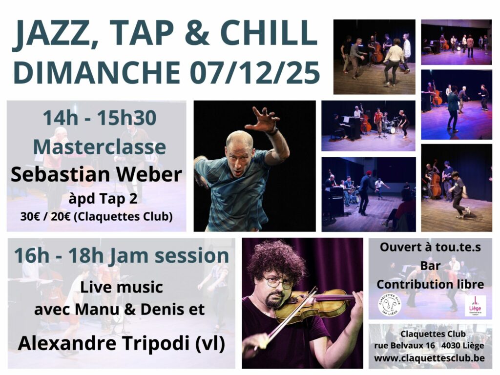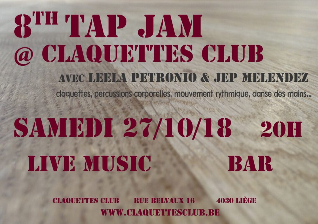 Et pourtant! Les conversations quotidiennes avec le public, amateur de jazz ou non, nous rappellent sans cesse la difficulté de faire comprendre l’essence profonde et intrinsèquement hybride de la forme et l’importance de continuer le travail entamé. Une des missions de l’asbl Tap Liège est de rétablir la connexion entre les deux et de réhabiliter les claquettes américaines comme un instrument de jazz à part entière.