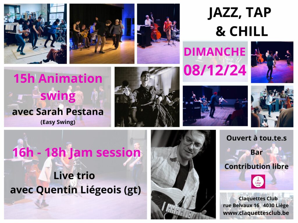 Les jam sessions du Claquettes Club, Jazz, Tap & Chill sont ouvertes à tout le monde: on peut être un simple spectateur, prenant plaisir à écouter les musiciens et regarder les danseurs. Mais on peut aussi s’impliquer beaucoup plus activement, en se lancant dans l’aventure de l’improvisation claquettes ou musicale, peu importe le niveau d’expertise.