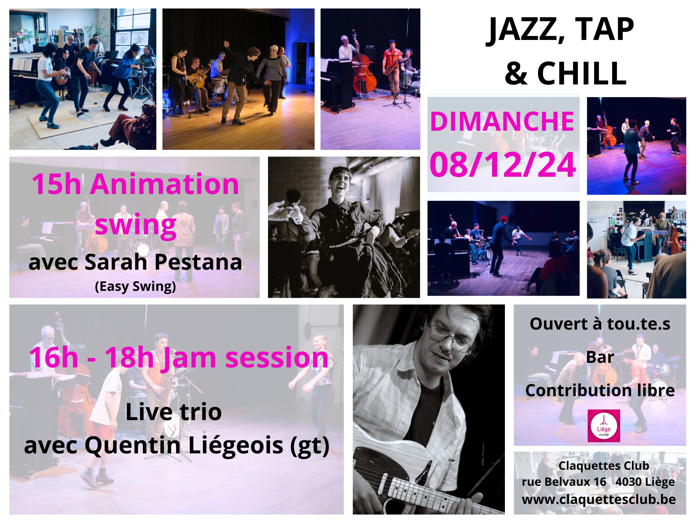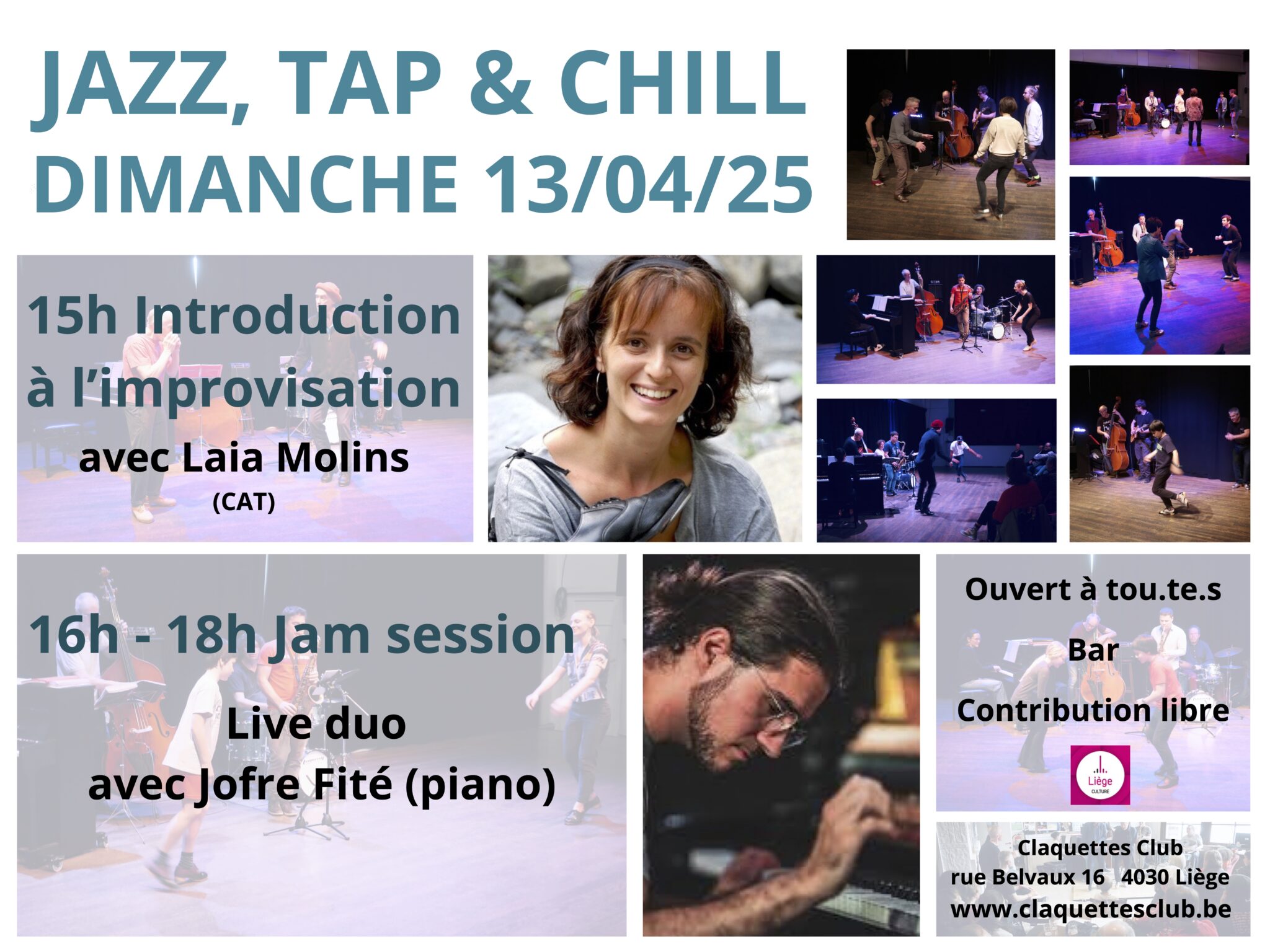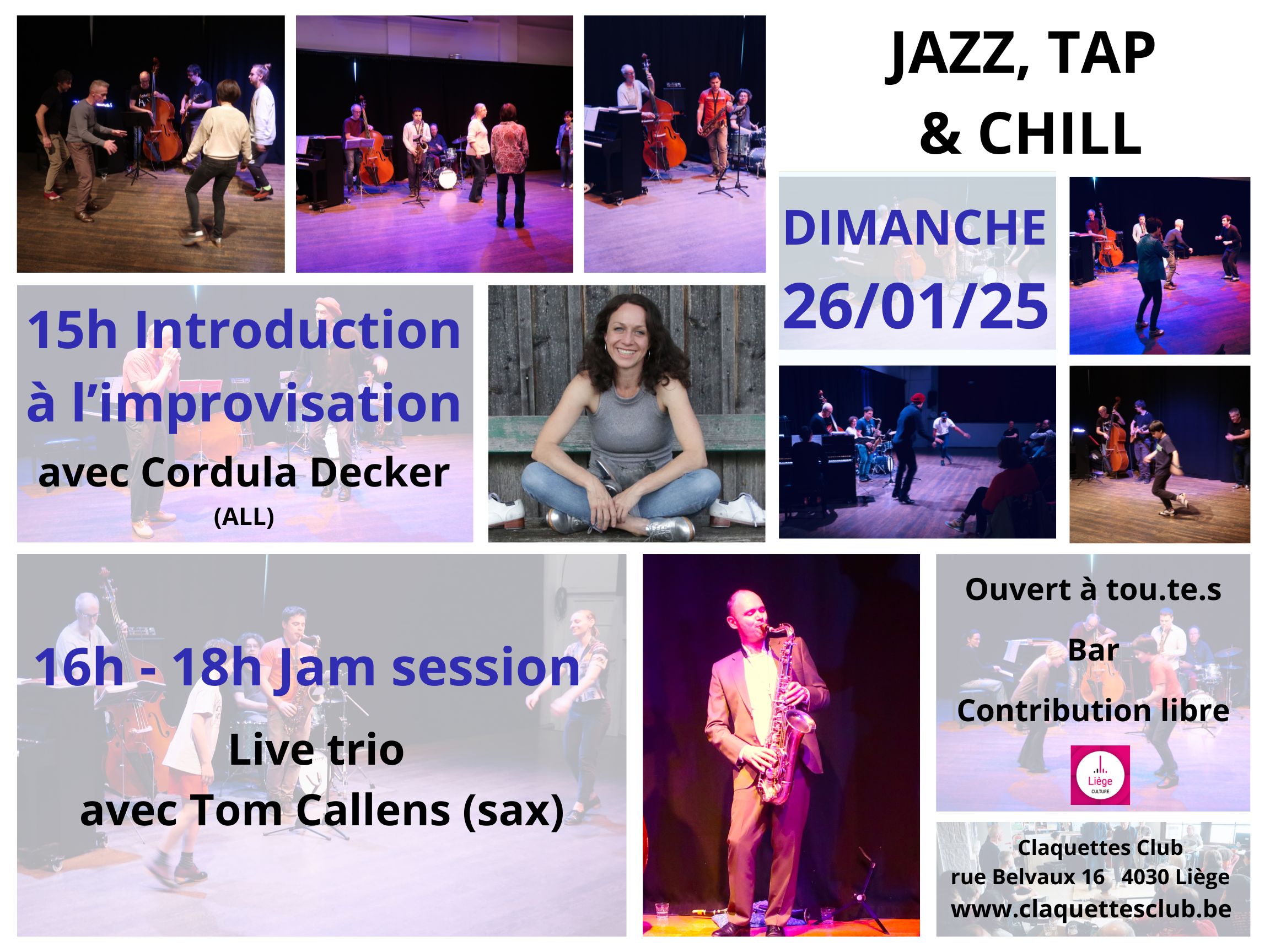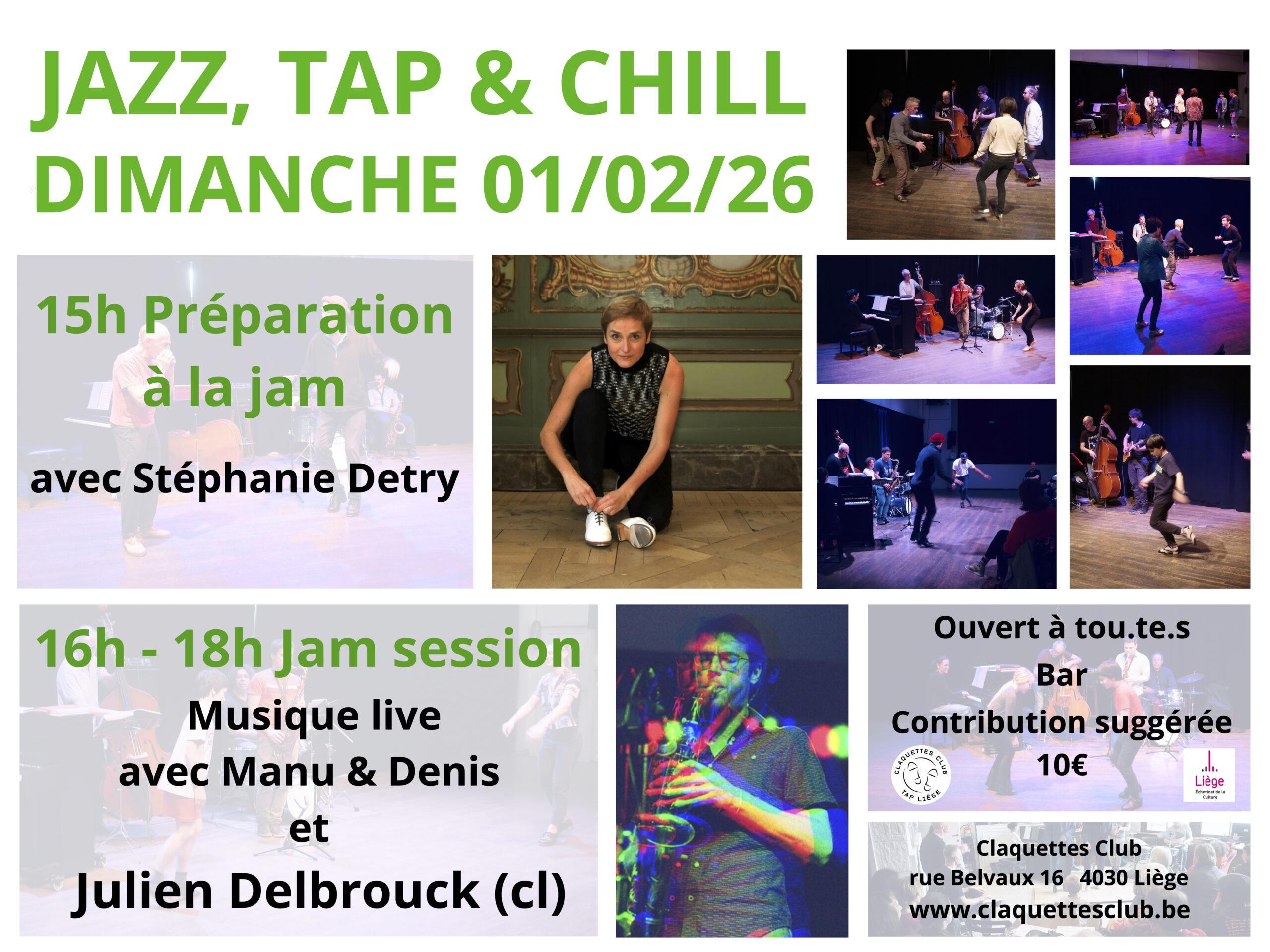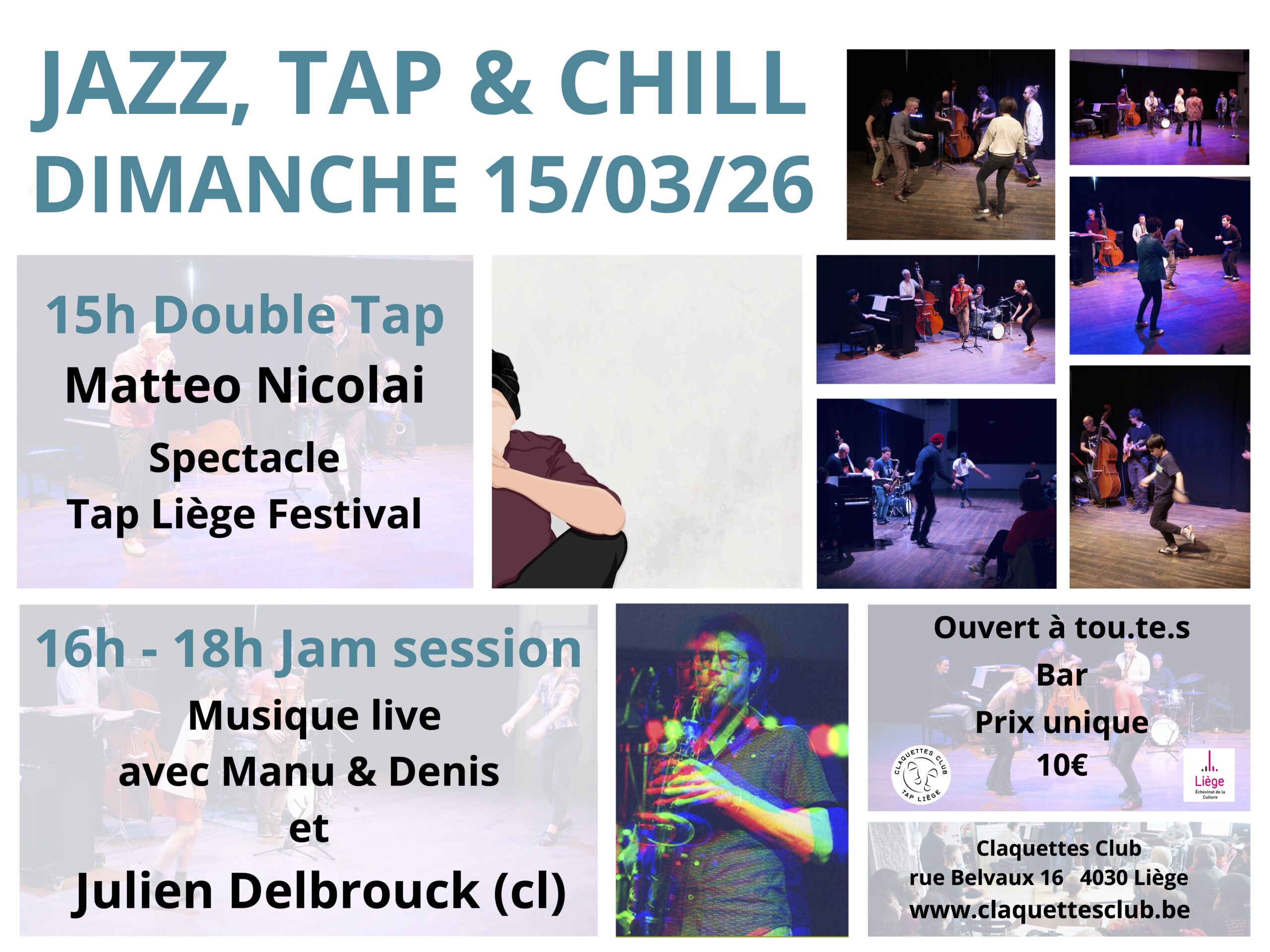 Les jam sessions du Claquettes Club, Jazz, Tap & Chill sont ouvertes à tout le monde: on peut être un simple spectateur, prenant plaisir à écouter les musiciens et regarder les danseurs. Mais on peut aussi s’impliquer beaucoup plus activement, en se lancant dans l’aventure de l’improvisation claquettes ou musicale, peu importe le niveau d’expertise.