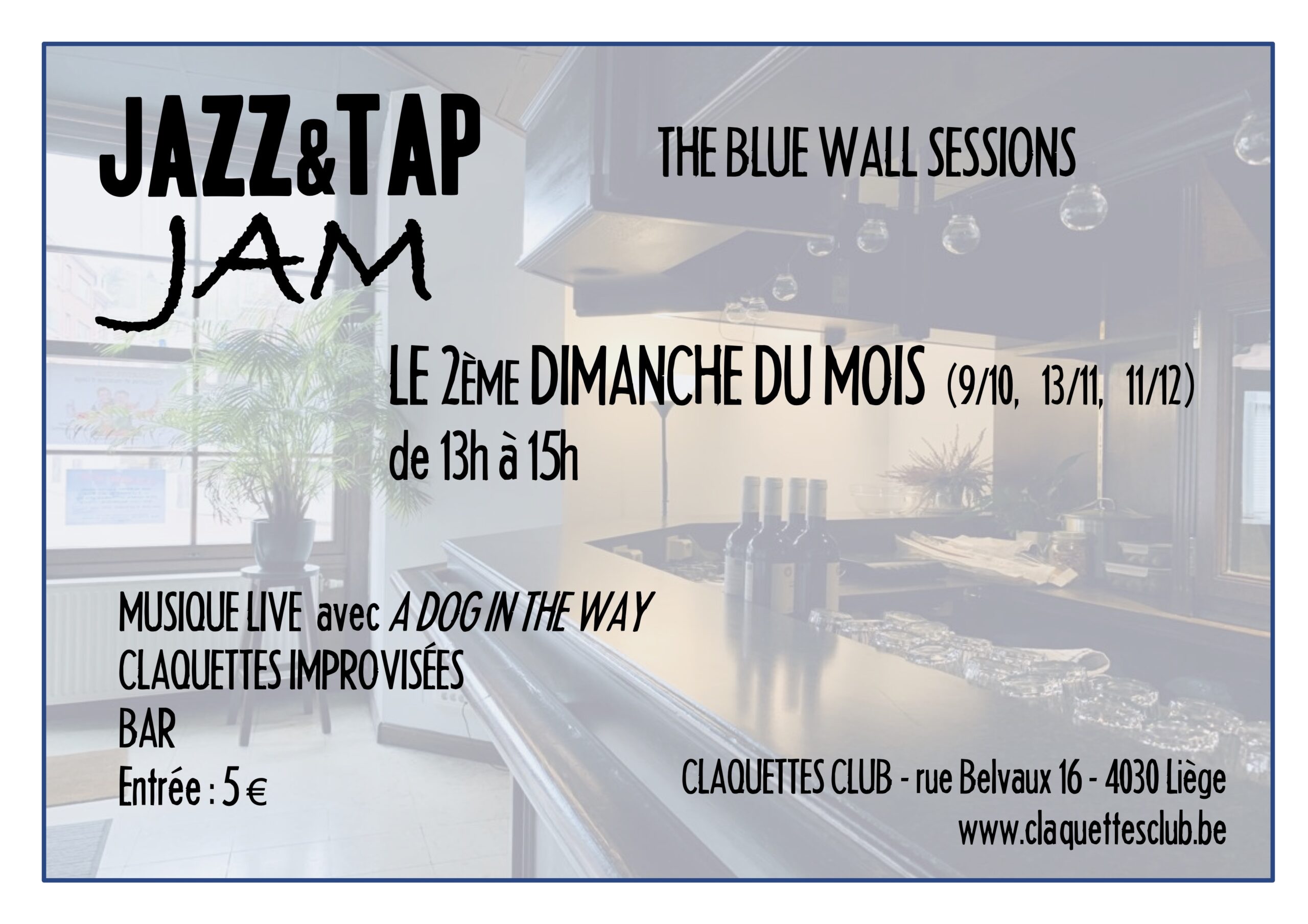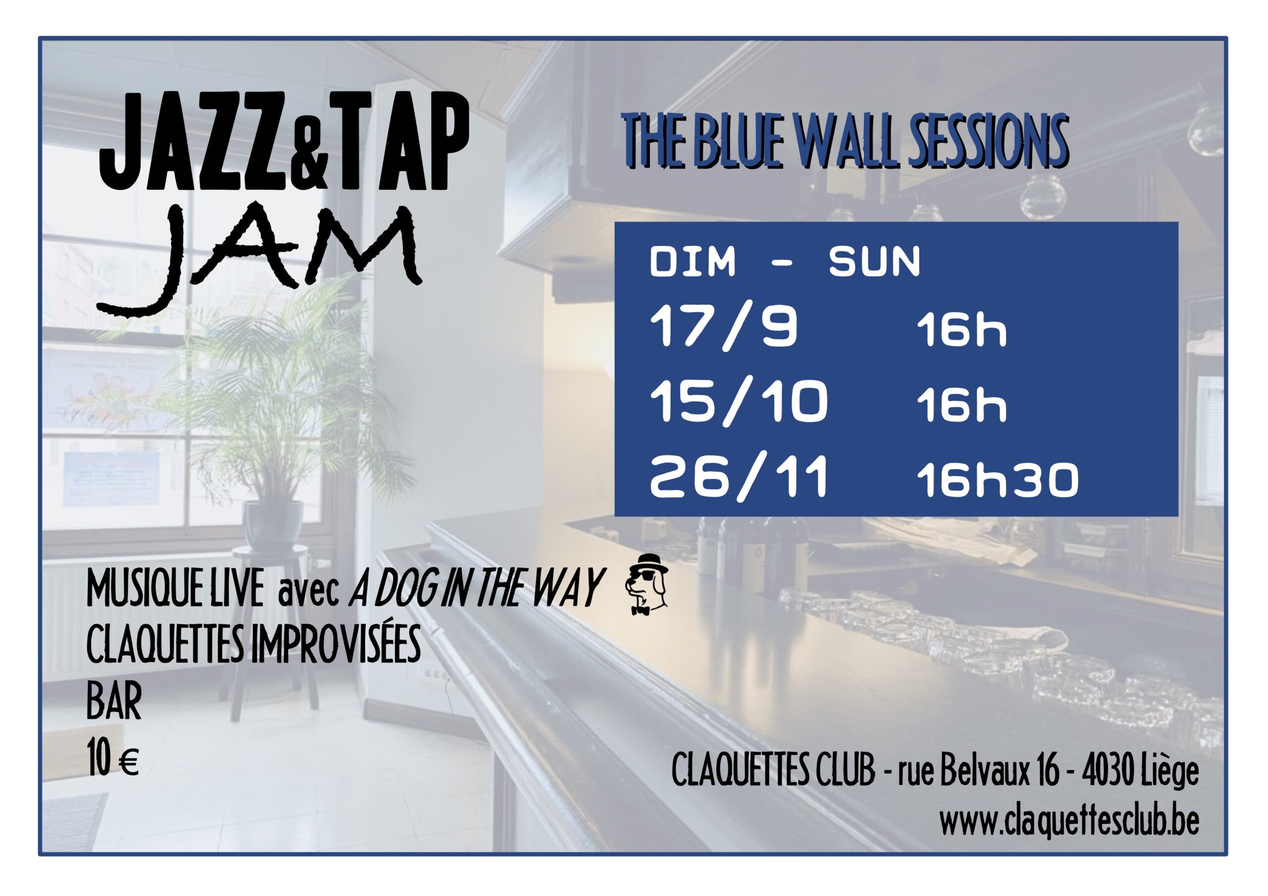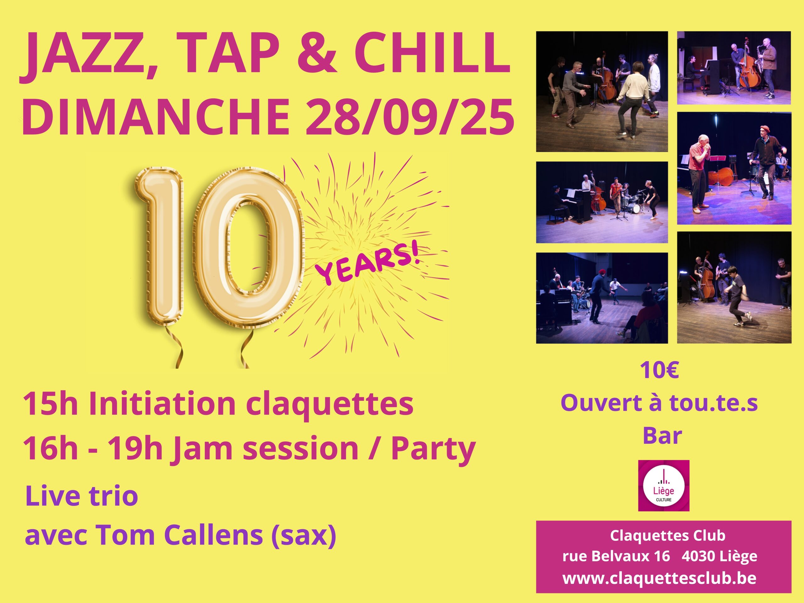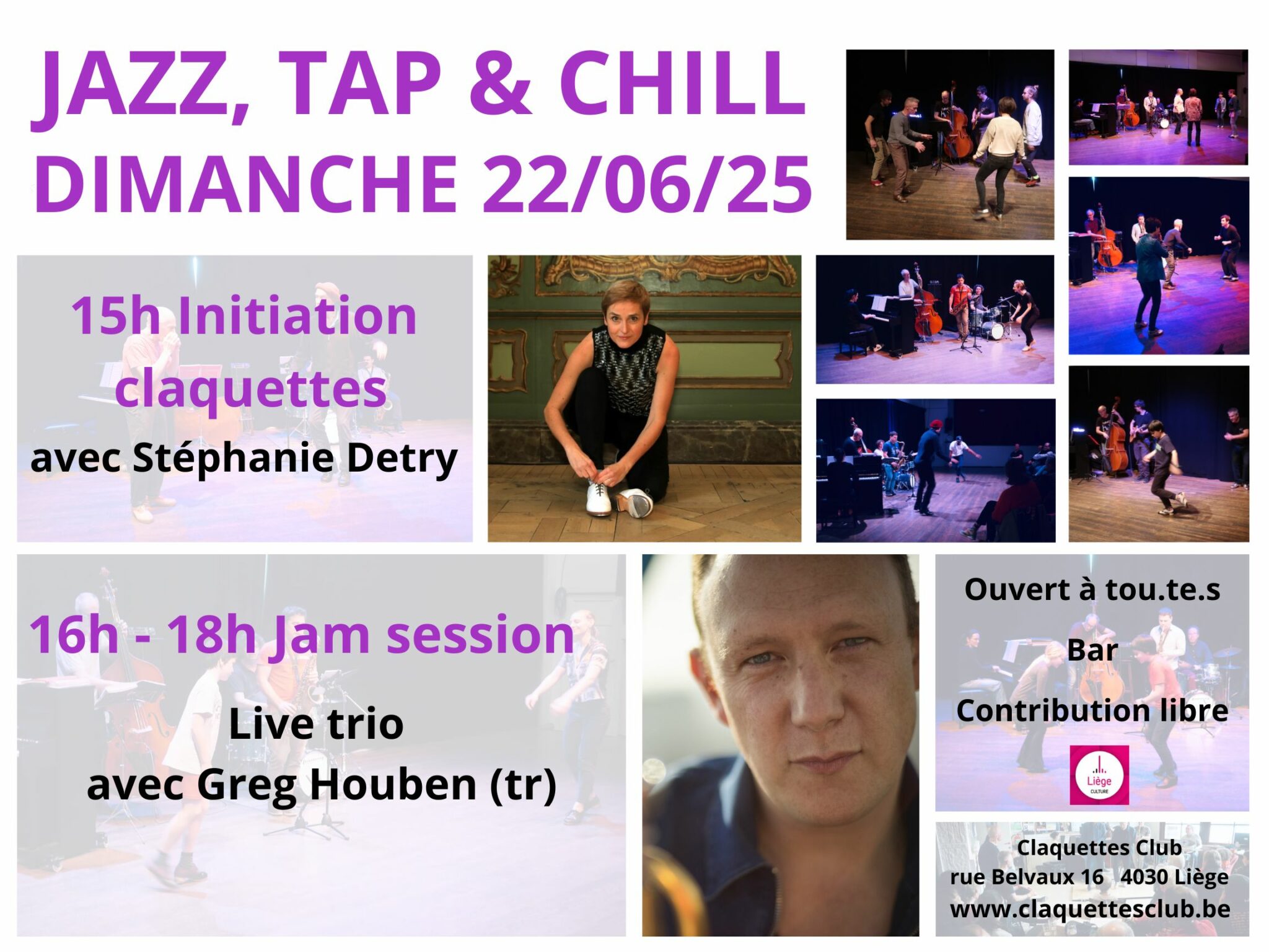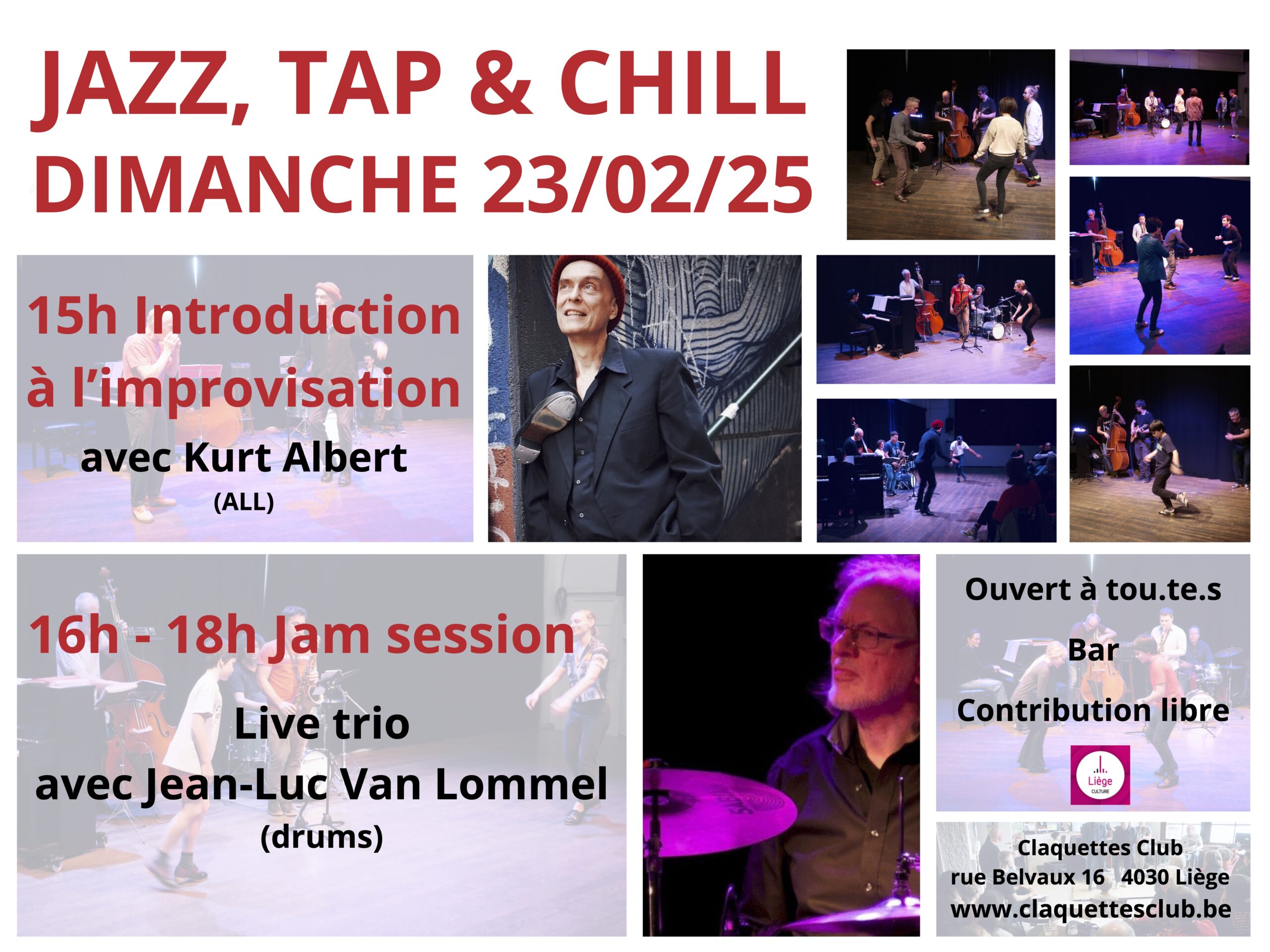 Les jam sessions du Claquettes Club, Jazz, Tap & Chill sont ouvertes à tout le monde: on peut être un simple spectateur, prenant plaisir à écouter les musiciens et regarder les danseurs. Mais on peut aussi s’impliquer beaucoup plus activement, en se lancant dans l’aventure de l’improvisation claquettes ou musicale, peu importe le niveau d’expertise.